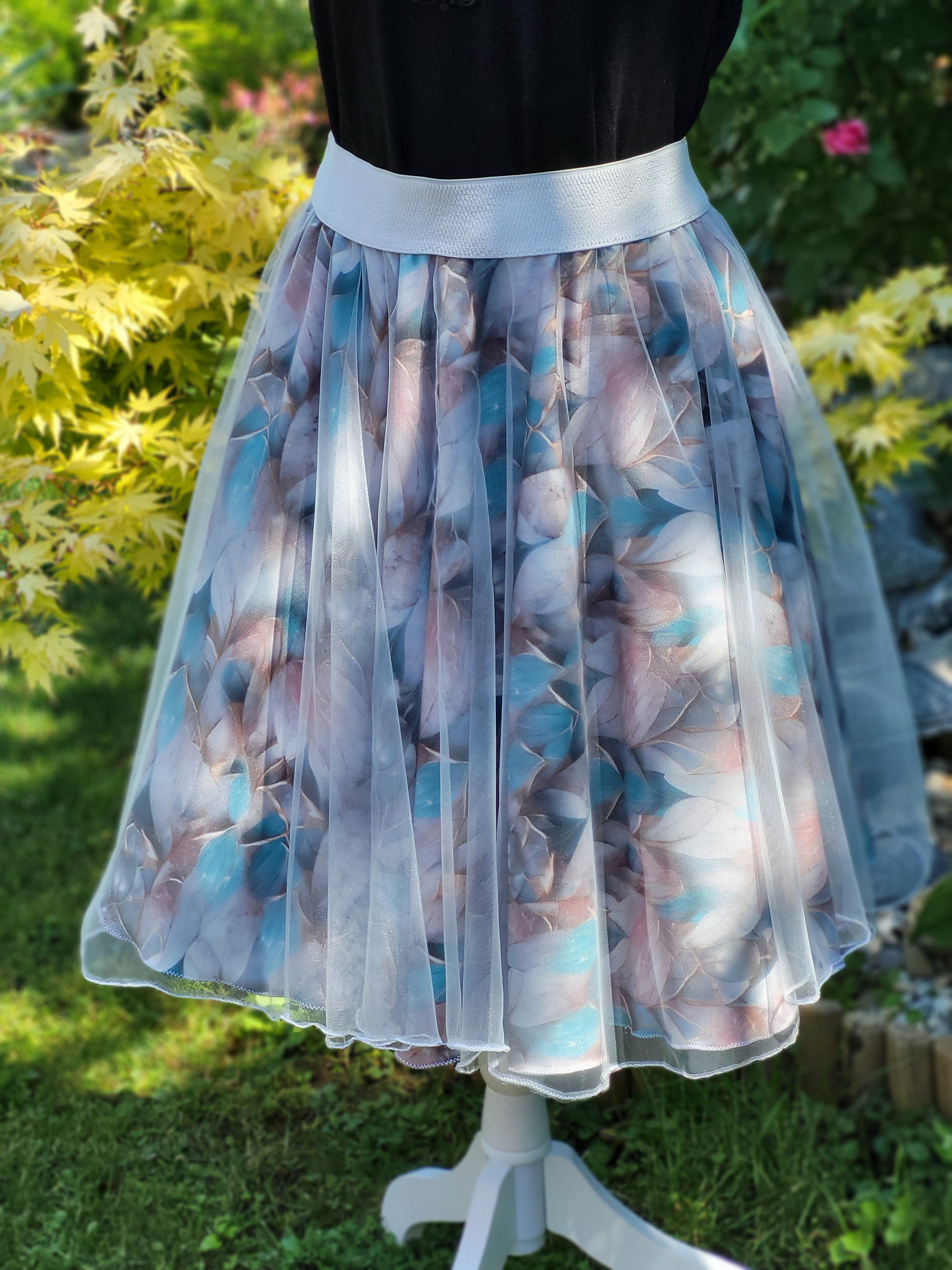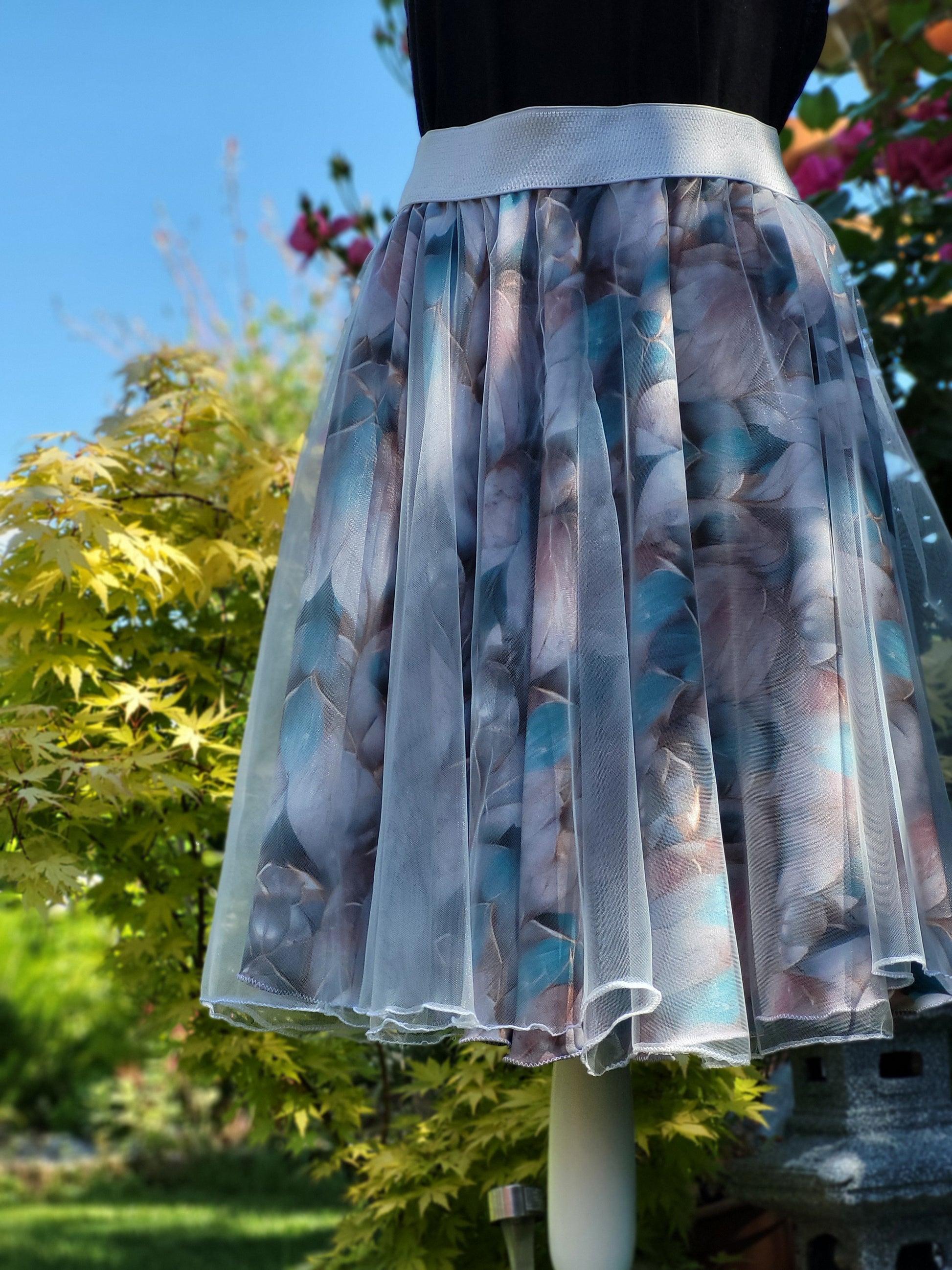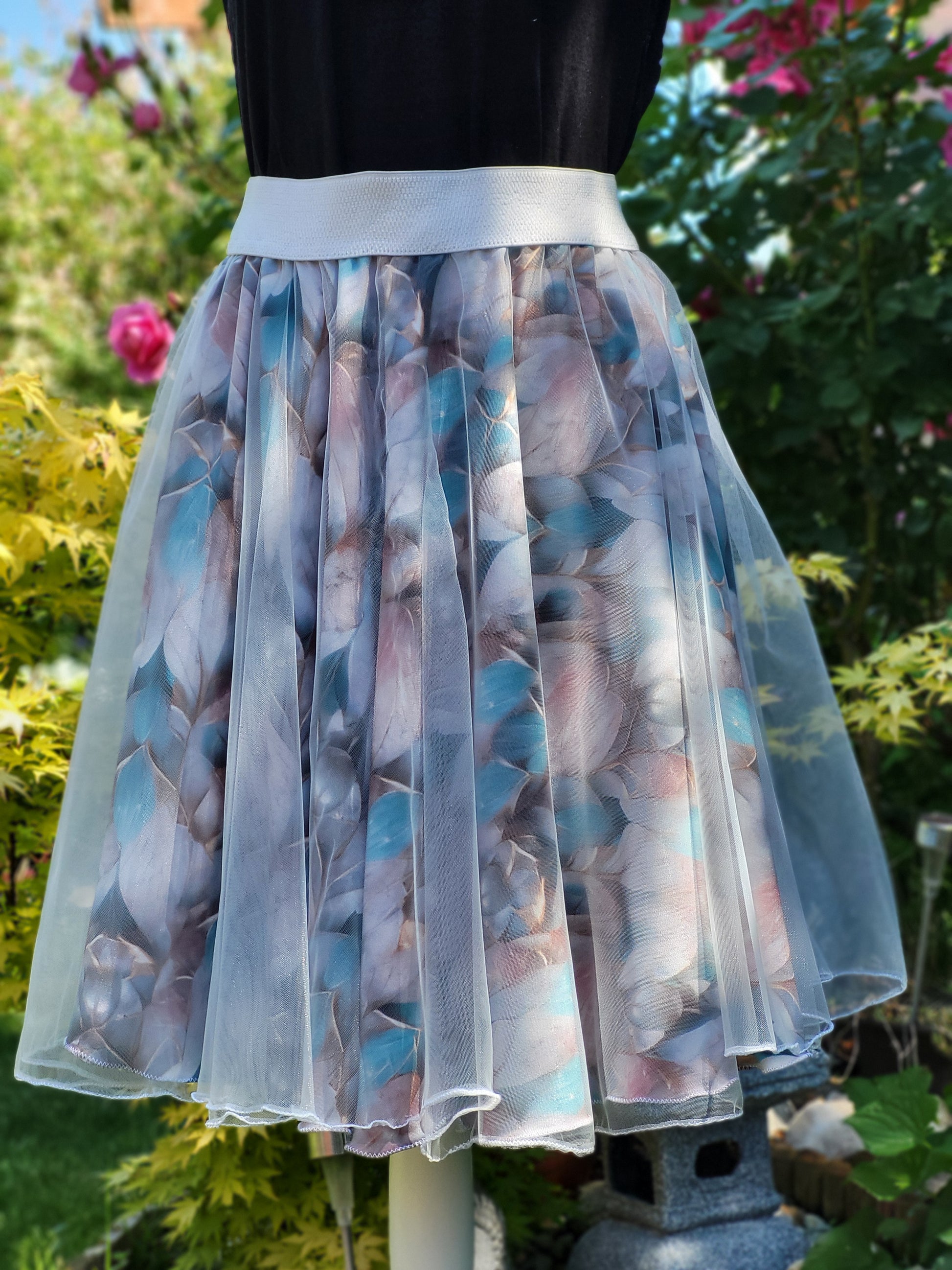 Egyedi, kézzel készült szoknya leveles mintájú Armani szaténból, tüll borítással