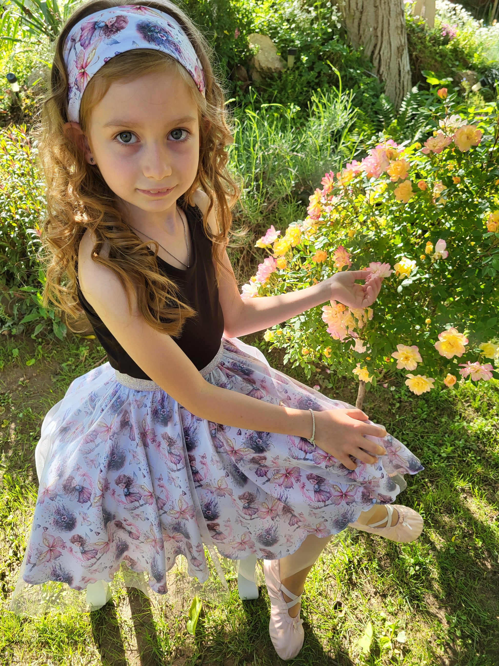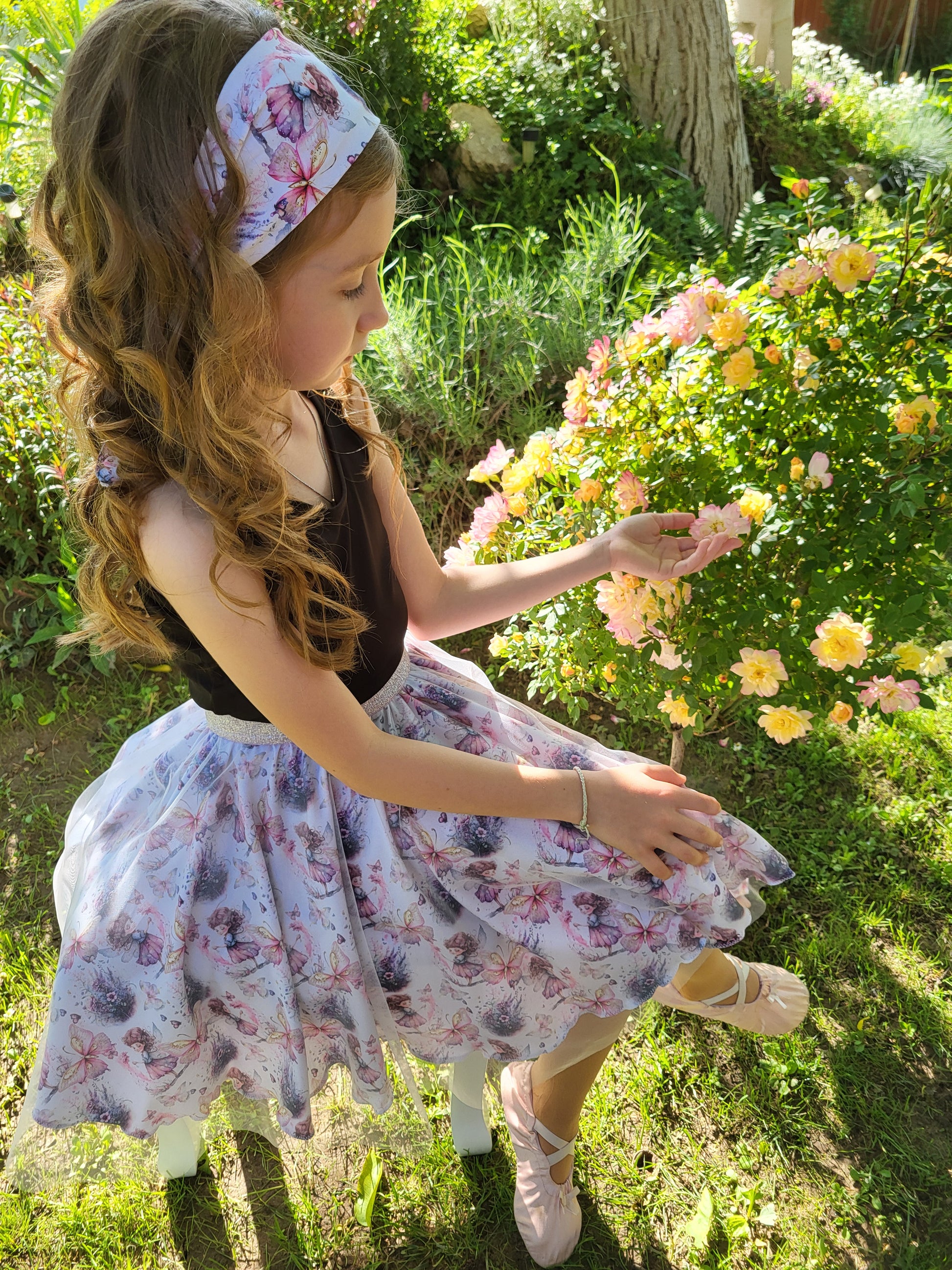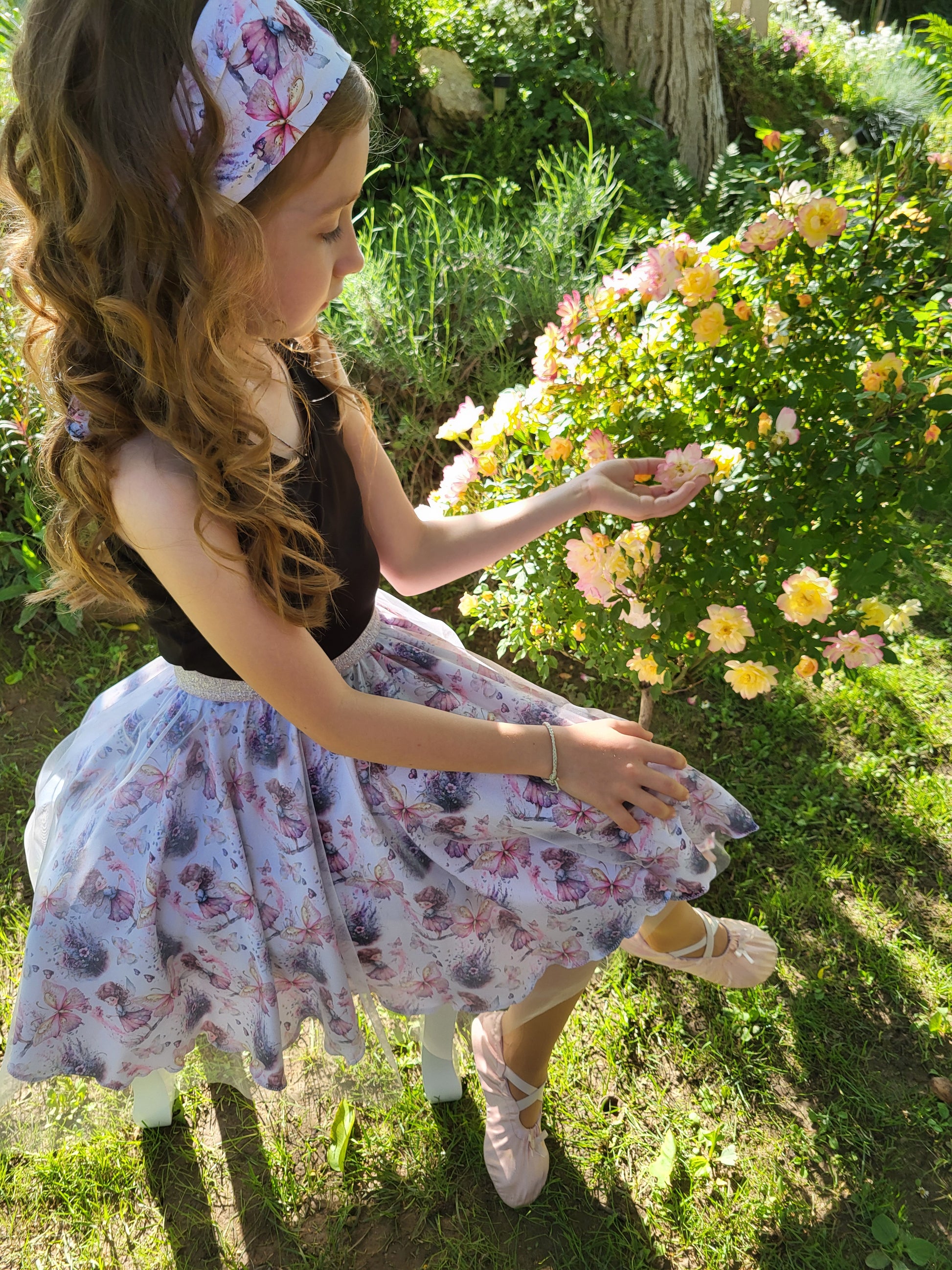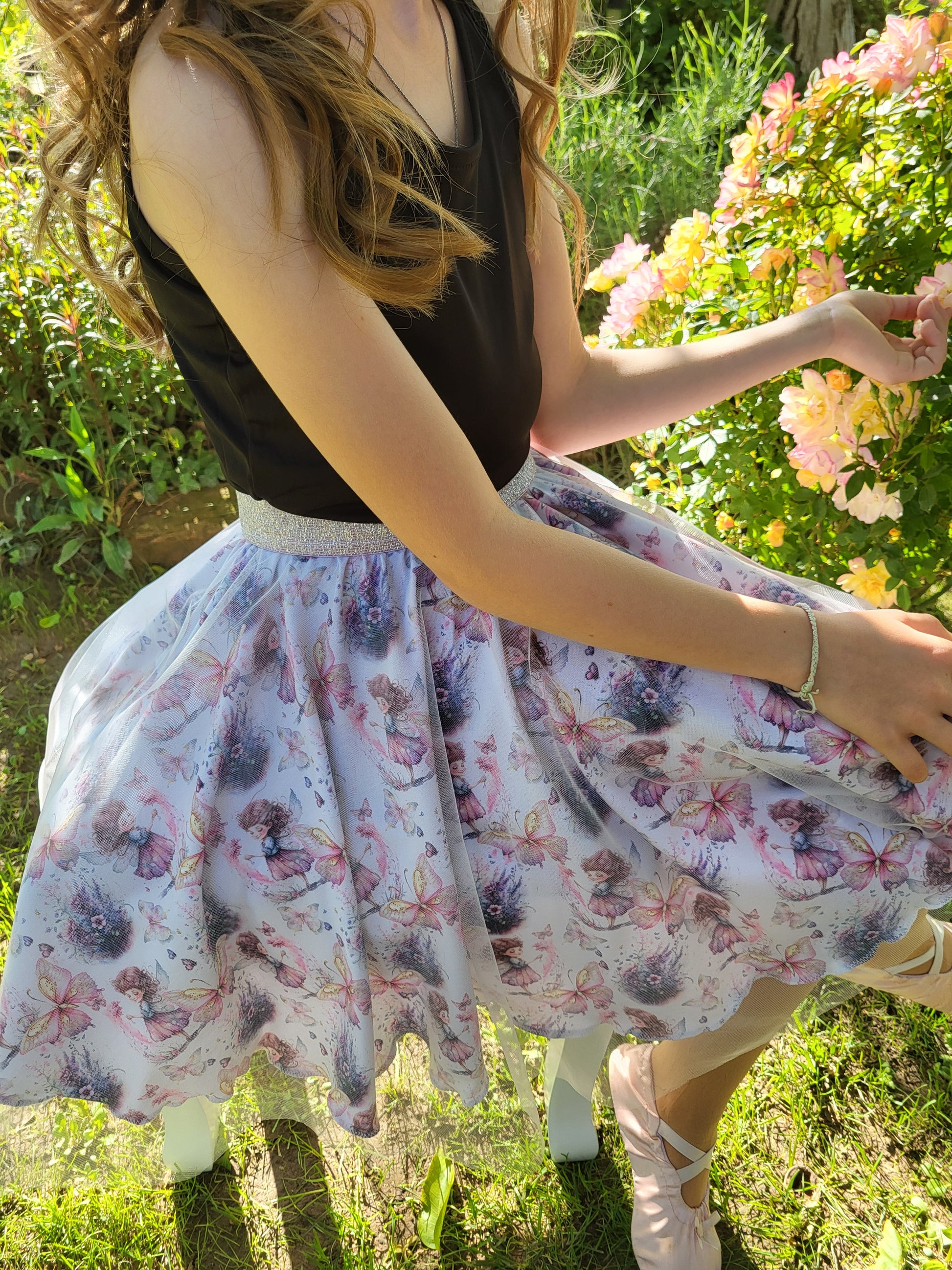 Ennek a szoknya alapját adó jersey anyag mintája tele van pillangókkal és apró tündérekkel, mint amilyen a mi kis műhelyünk ötlet-gazdája.