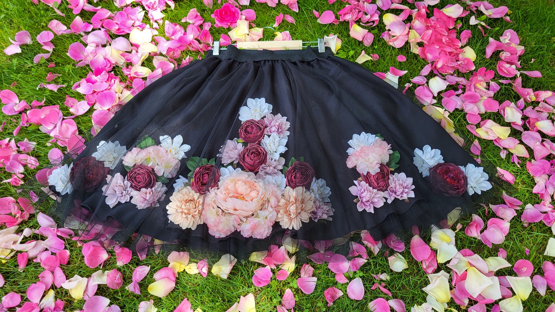 Lépj be a tündérmesék világába ezzel a gyönyörű, fekete minimatt anyagú tüll szoknyával, amelyet finom virágdíszek tesznek különlegessé.
