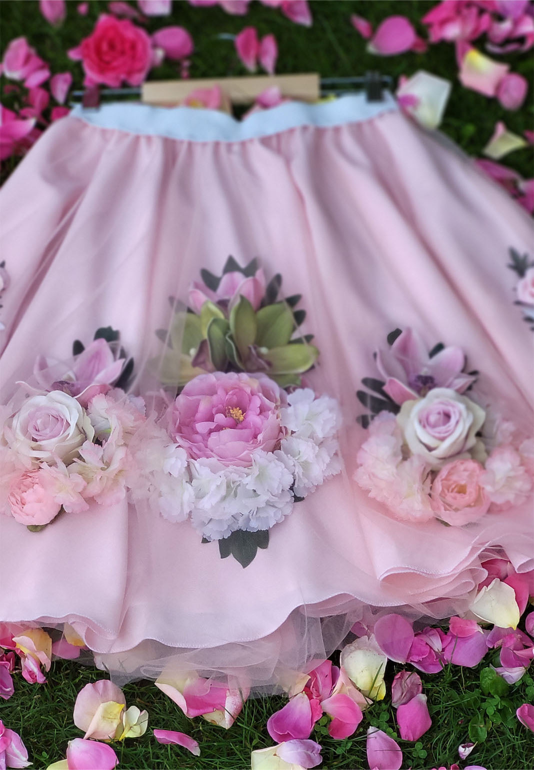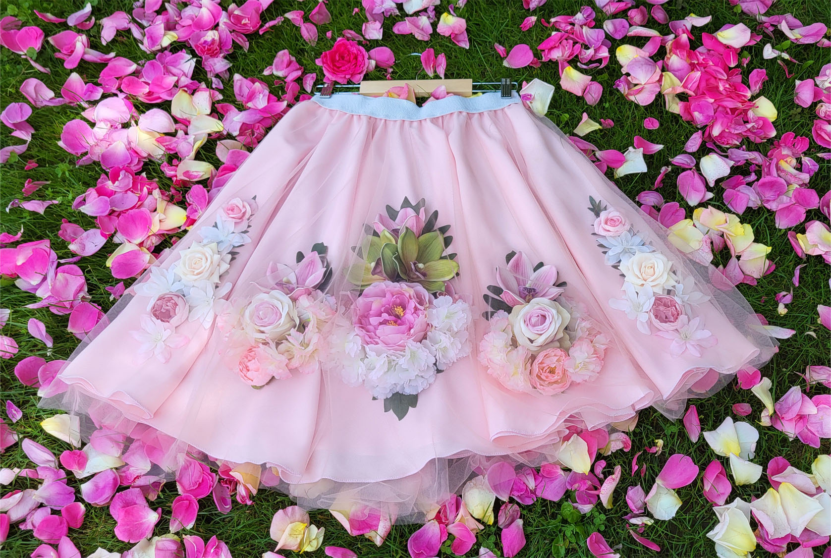 Lépj be a tündérmesék világába ezzel a gyönyörű, világos rózsaszín minimatt anyagú tüll szoknyával, amelyet finom virágdíszek tesznek különlegessé.